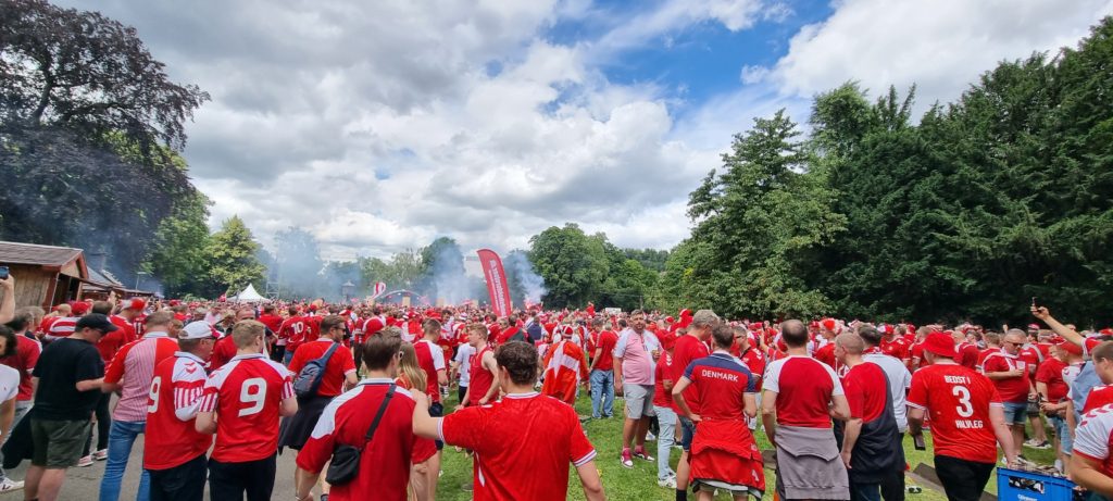 Efter en god omgang morgenmad ved en bager inde i byen, gik vi mod den danske fanzone og her blev vi mødt af endnu flere danske fans. Det frembragte et meget bredt smil på læberne, med tankerne om at det her bliver en af de helt gode dage.