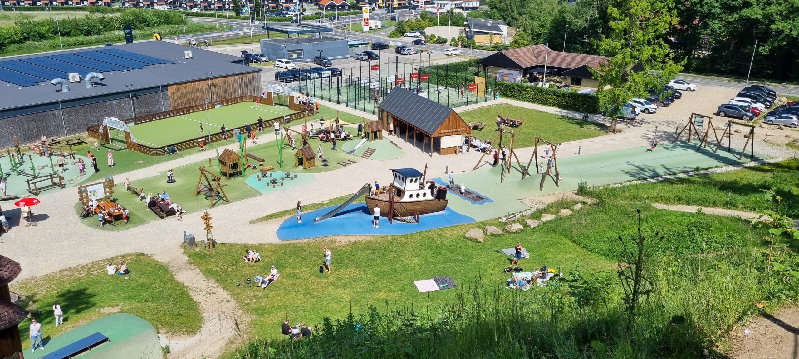 Jeg er en kæmpe fan af steder, der skaber fællesskab, og Juelsminde Naturlegepark er et lysende eksempel. Mens vi var der, oplevede vi noget, der var så hjertevarmt, at jeg stadig smiler ved tanken. Vores store dreng, Valdemar, som er helt vild med fodbold, stod og kiggede på nogle ældre børn, der spillede på fodboldbanen. Pludselig spurgte de ham, om han ville være med – og det ville han selvfølgelig meget gerne! Det er de spontane møder og den umiddelbare leg, der opstår, når der er et fælles tredje, der binder børnene sammen, selvom de ikke kender hinanden. Dét er meget rørende.